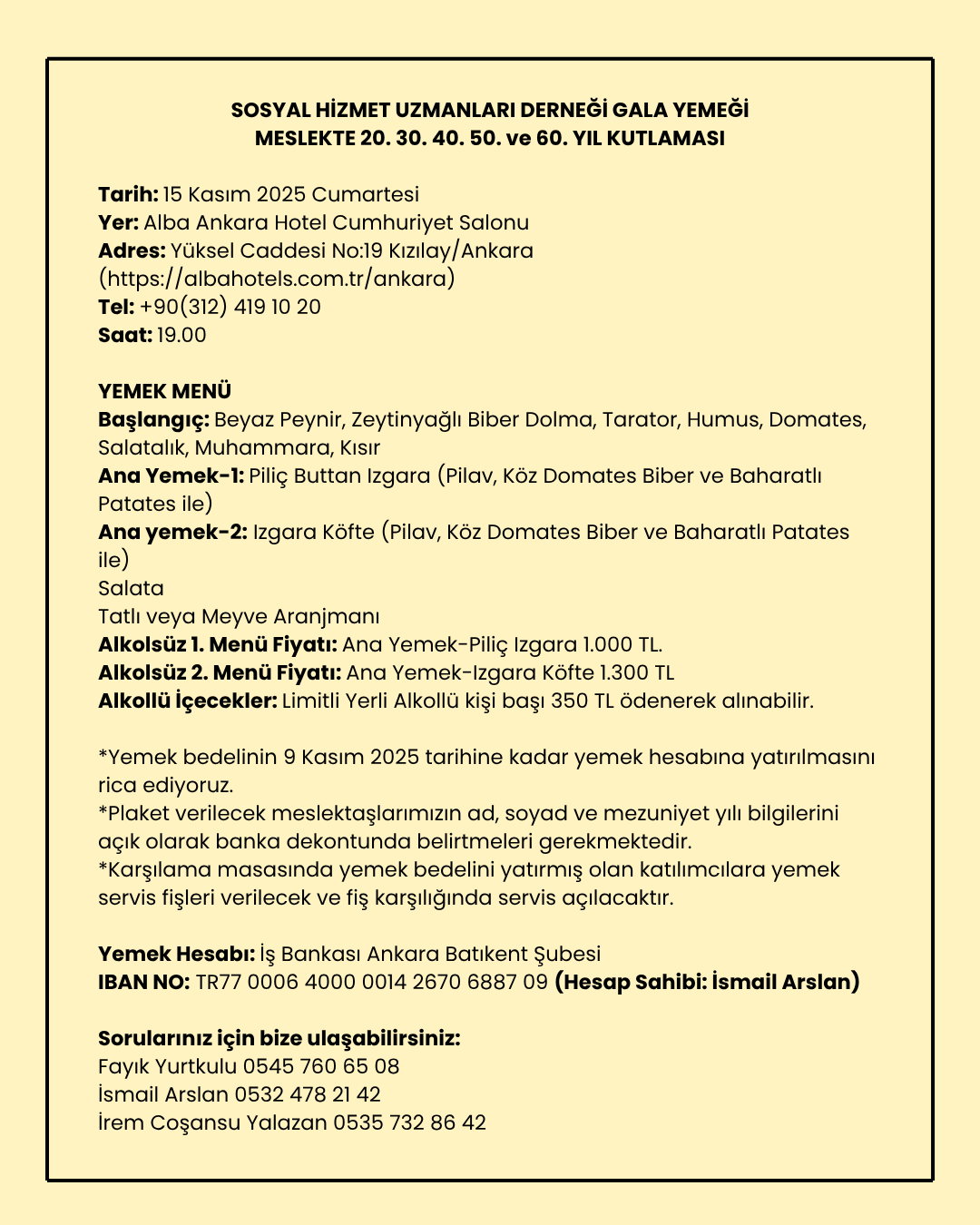 Bu yıl geleneksel meslekte 20., 30., 40., 50. ve 60. yıl kutlama yemeğimizi, kongre gala yemeği ile birlikte gerçekleştiriyoruz. Gecemiz, meslektaşımız Derya Yelekçi’nin konseri ile renkleniyor.
