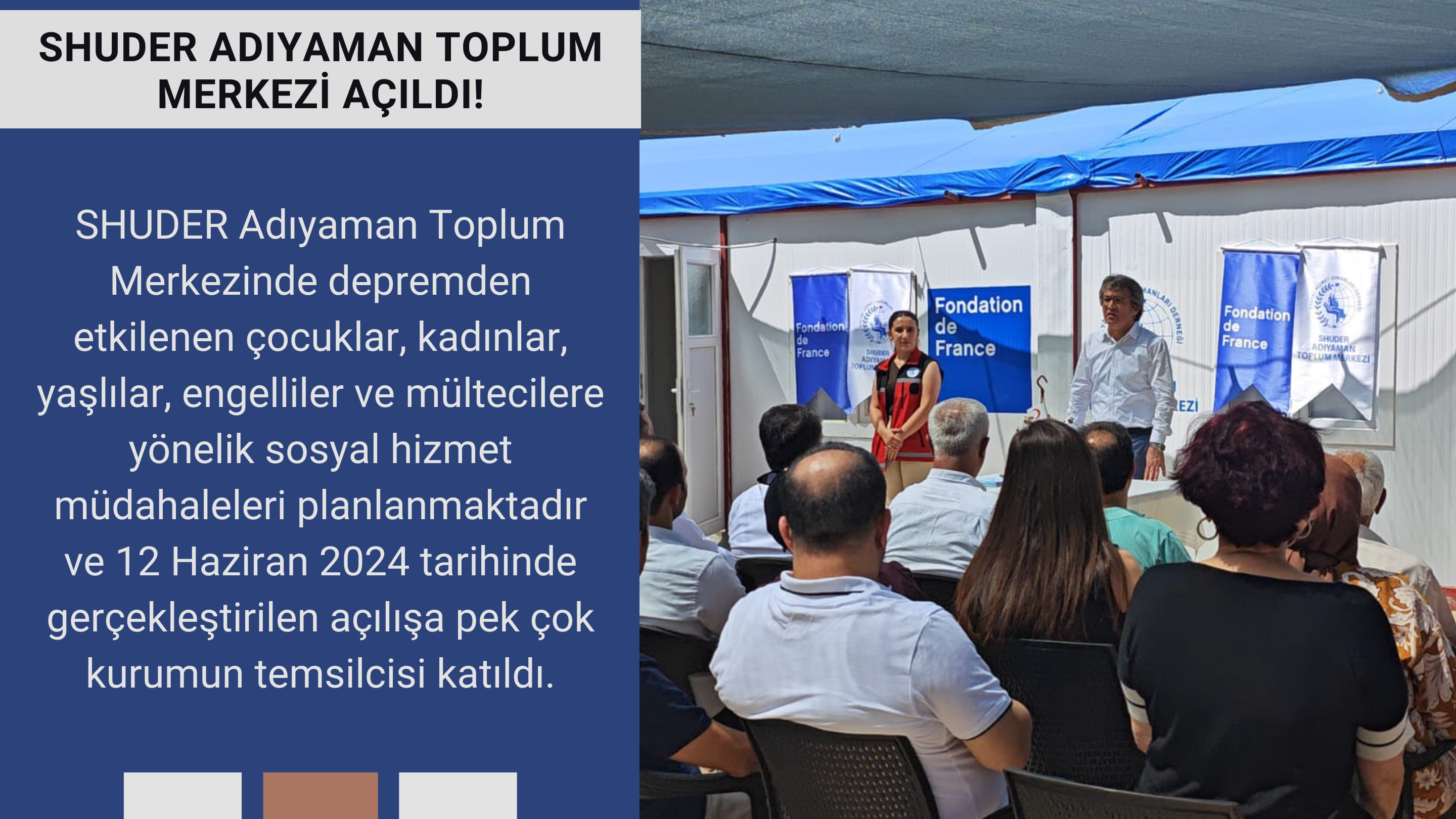 SHUDER Adıyaman Toplum Merkezinde depremden etkilenen çocuklar, kadınlar, yaşlılar, engelliler ve mültecilere yönelik sosyal hizmet müdahaleleri planlanmaktadır ve 12 Haziran 2024 tarihinde gerçekleştirilen açılışa pek çok kurumun temsilcisi katıldı....
